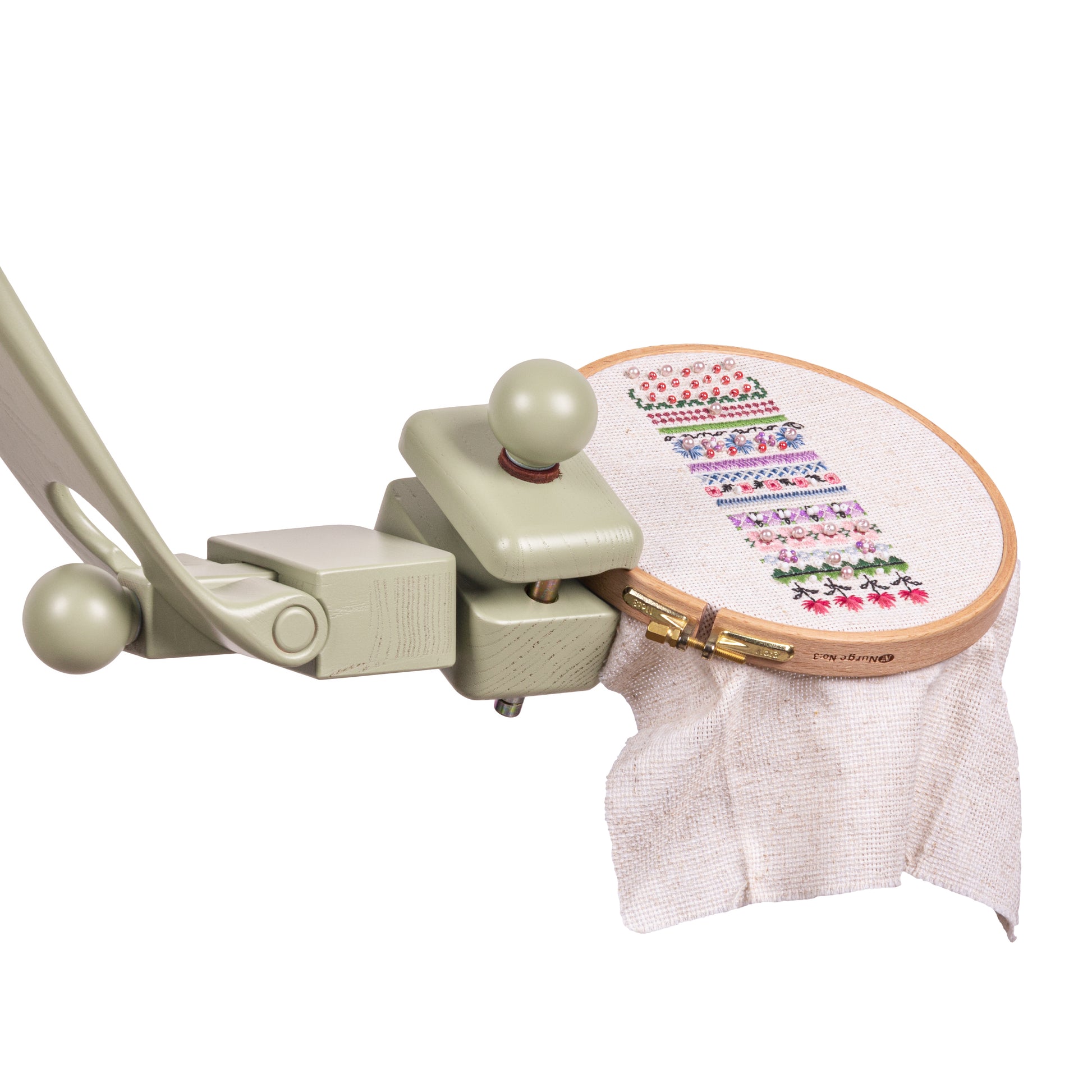 Discover our Cross Stitch Stand M4. Its natural Green cream color and solid wood texture, combined with a matte finish, exude classic elegance. This floor stand reliably accommodates Q-snaps, scroll frames, or hoops, offering you embroidery comfort.