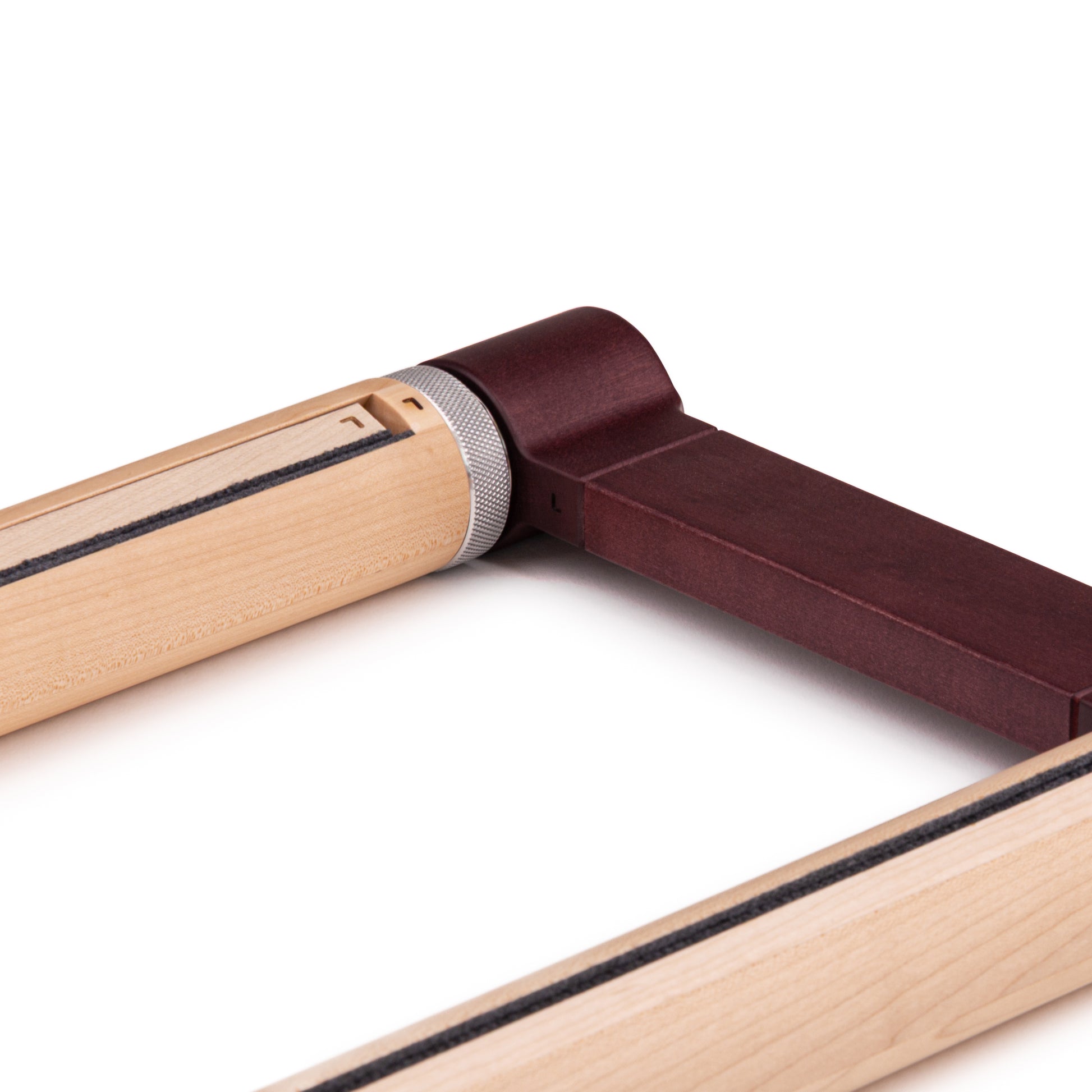 The RETREAT scroll frame consists of two rollers connected by side panels. Fabric tension between the two rollers is achieved by controlling the direction of roller rotation. One of the side panels has built-in mechanisms that allow you to set the direction of roller rotation. This system allows for gentle and effective tensioning of the fabric.